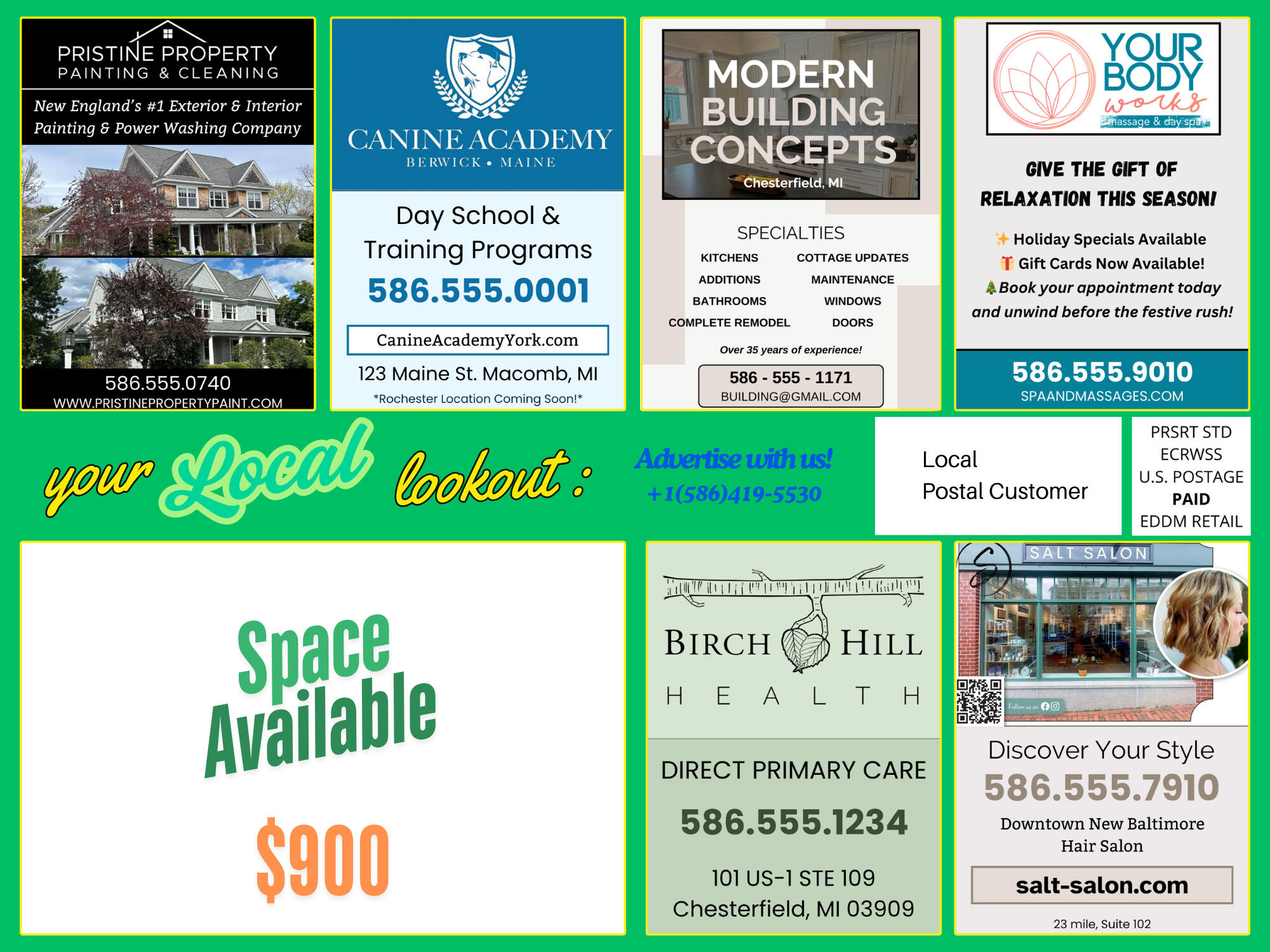 If you are a local business in Macomb Township, you now have the opportunity to be apart of a huge 9"x12" postcard going directly to the residents of Macomb. By teaming up with 15 other local non-competing businesses, marketing is made possible at a low cost! In an increasingly digital world physical products stand out!